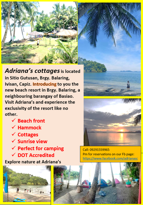 Adriana’s Cottages Rental is a Department of Tourism (DOT) Accredited resort. The only beach resort in Brgy. Balaring, a neighbouring barangay of Basiao. Perfect for weekend getaways and vacations. Visit Adriana’s and experience the exclusivity and serenity of the resort like no other. The resort offers beautiful beach front view with hammock, rental cottages, a breath-taking Sunrise view perfect for camping!